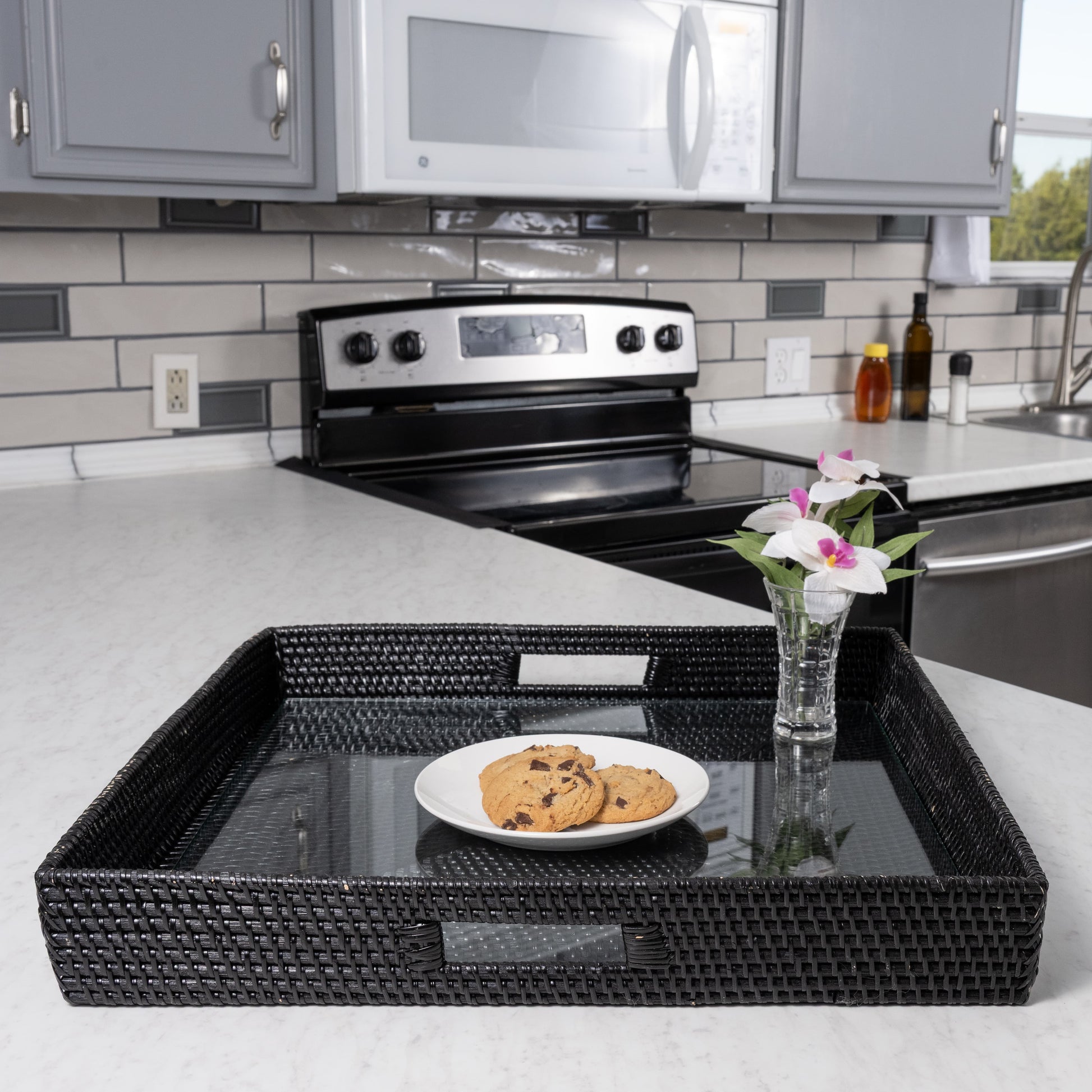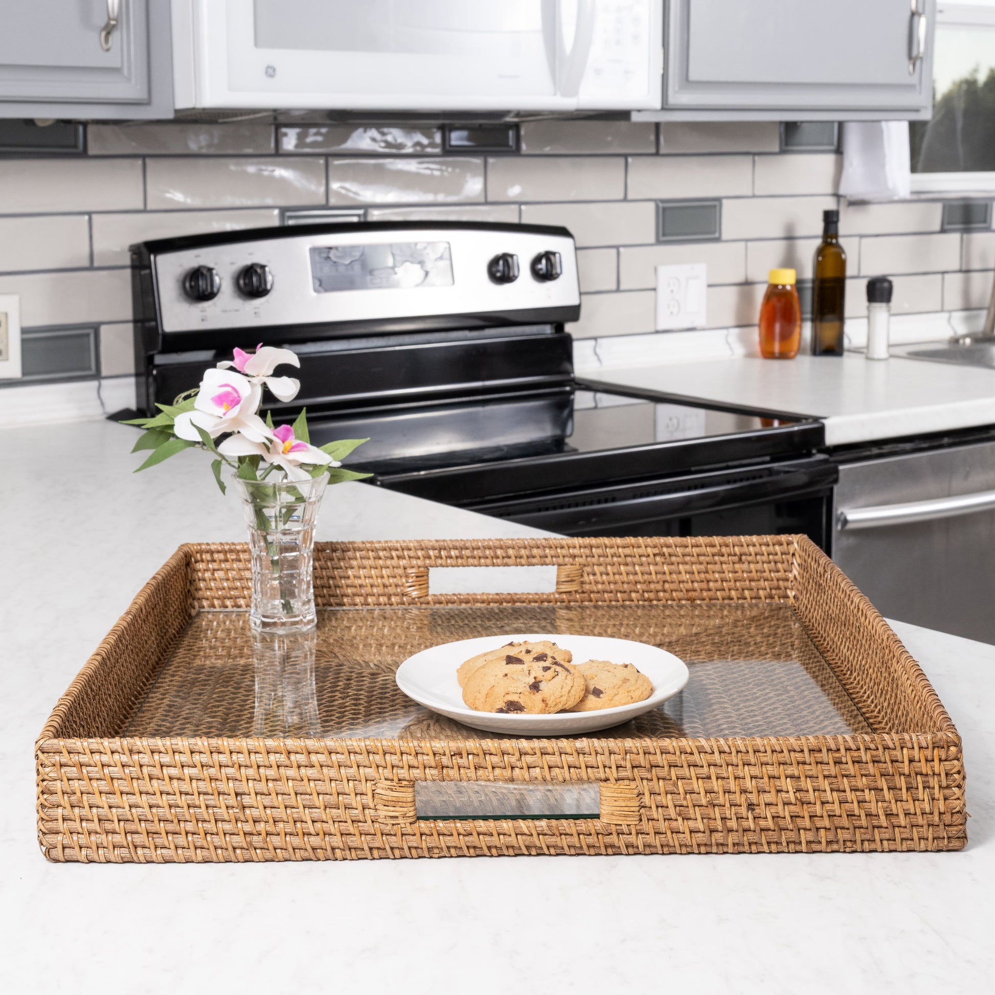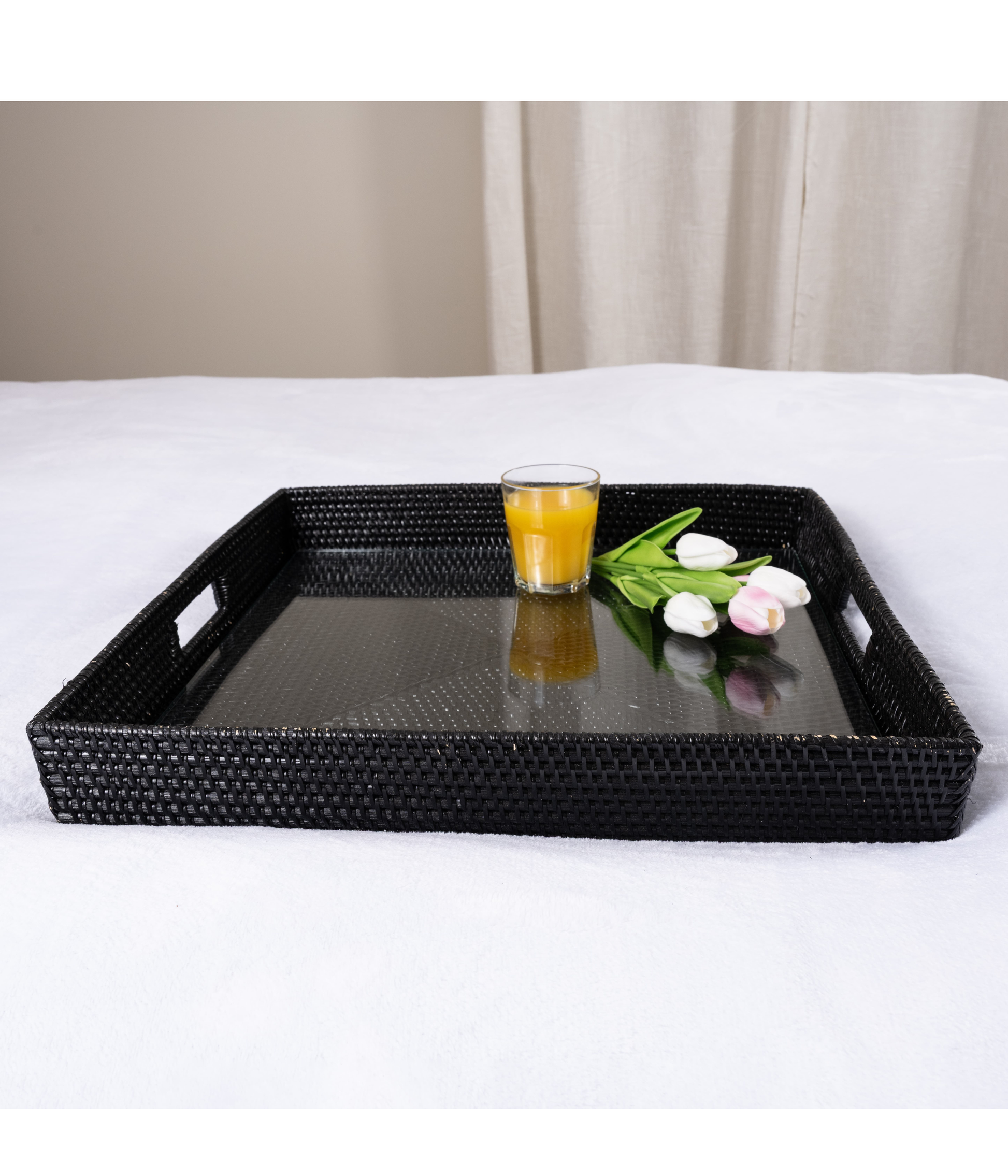 Rattan Square Serving Tray with Glass Insert
